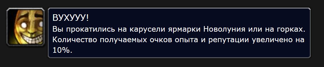Бафф Ярмарки Новолуния, ВУХУУУ! увеличивает не только репутацию, но и получаемый опыт. Стоит поддерживать его во время прокачки альта, даже если вы качаетесь в подземельях.
